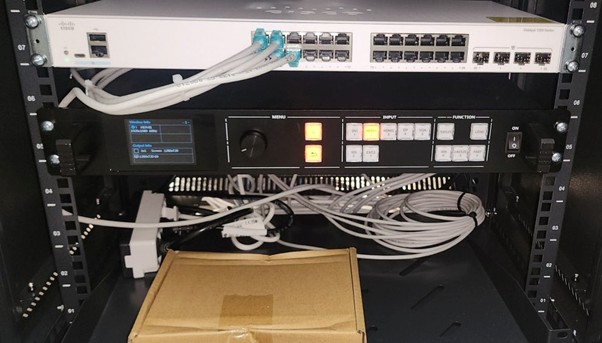 3명의 엔지니어가 작업을 동시에 진행하면서, 한명은 장비실에서 시스템 랙에 장비들을 마운트 시키고, 다른 한명은 회의실 천장 배관/배선 작업을, 다른 한명은 랠리카메라(Rally Camera) 를 전자교탁에 연결하고 펌웨어를 업그레이드 하는 등 각각 작업을 나누어서 진행하였습니다. 효율적으로 빨리 작업을 마칠 수 있도록 기대하면 서요...
