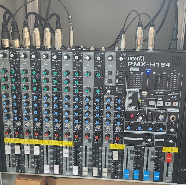 오디오 믹서의 여유 있는 채널에 마이크 4대와 줌(Zoom)으로 출력 될 PC 출력을 연결합니다.